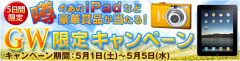 が、2010年5月1日〜5月5日の5日間に、A8セルフバックで1件以上成果を発生させ、6月30日までに成果が確定された方の中から、抽選で5名にiPadやDSなど豪華商品をプレゼントする「ゴールデンウィーク限定キャンペーン」を開催しています。