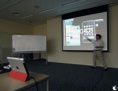 iPad (3rd generation)をプロジェクターの横におき、iPhone/iPadアプリ「Keynote」を発表者モード表示にして、iPhone 4SのiPhoneアプリ「Keynote Remote」を利用することで、演台から離れ動き回りながらプレゼンテーションを行っていました。