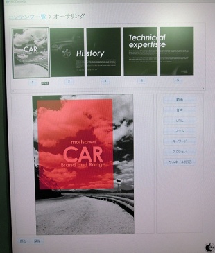 page2013において、モリサワが、カタログ素材をアップロードするだけで電子カタログが生成できるASPサービスで、読者側は、無料のカタログ閲覧アプリで見ることができる「MCCatalog」(仮称)を参考展示していました。