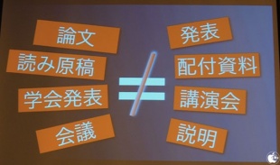 論文と発表、読み原稿と配布資料、学会発表と後援会、会議と説明は、どれもイコールではないと説明した。