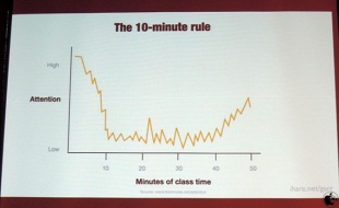 脳科学では、こうしたプレゼンテーションに関連する研究資料があり、10分間隔でピンポイントを入れることが重要だと説明した。