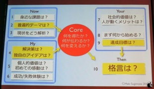 コアとして「何を得たか?何が伝わるか?何を変えるか?」を絶えず考えるべきだと語り、身近な課題や普遍的なテーマを紹介し、解決策や独自のアイデアを提案し、社会的な価値や達成目標を示すことがテクニックとして使覚えた方が良く、そのコアを中心に置き「Why、How、What」で進めるのが格言だと話した。