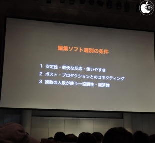 編集ソフト選別の条件として「安定性・軽快な反応・使いやすさ」「ポスト・プロダクションとのコネクティング」「複数の人数が使うー>協調性・経済性」といったことが上げられると説明していました。