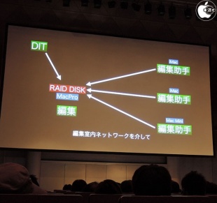 編集ネットワークを介して、MacProのメイン編集機に、iMacを2台、Mac miniなどをネットワーク接続し、編集助手によるグループ編集を行ったと説明しました。