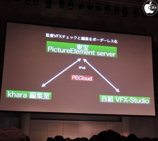 ある程度の編集作業が終わった段階で、東宝のPictureElement server、khara編集室、白組 VFX-Studioの3ヶ所の編集作業現場をIPv6とPECloudによる完全同期を行い、監督VFXチェックと編集をボーダレス化したと説明していました。