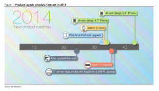 それによると、2014年第2四半期末に、iMacのアップデートとローエンドモデルの追加が行われ、2014年第3四半期後半に、4.7インチiPhone、2つのサイズのiWatch、iPad AirとiPad miniのアップデートが行われ、2014年第4四半期前半に、MacBook AirとMacBook Proのアップデートに加え、MacBook Pro (Retina, 12-inch)の追加、Apple TVアップデート、2014年第4四半期後半に、5.5インチiPhoneが出荷されると予測しています。
