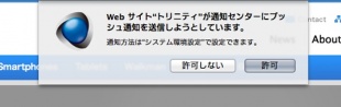 2013年12月05日(木) Safari#OS_X_Mavericks#Safari#通知#トリニティ トリニティ、自社サイトをSafari 7.0のウェブサイト通知機能に対応 ※本サイトは、アフィリエイト広告および広告による収益を得て運営しています。購入により売上の一部が本サイトに還元されることがあります。 トリニティが、自社サイトをSafari 7.0のウェブサイト通知機能に対応したと発表しています。 これにより、トリニティサイトにアクセスしなくても、サイトの更新情報を、OS X Mavericksの通知で受け取ることが出来るようになります。 関連エントリー:OS X Mavericks:Safari 7.0のウェブサイト通知機能は、他社のウェブサイトによる対応が必要