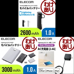 エレコムわけありショップ、Lightningコネクタ搭載ACアダプタや、Lightningコネクタ搭載モバイルバッテリーを760円で特価販売中