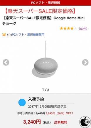 楽天ブックス、楽天スーパーSALEで「Google Home Mini」を3,240円で特価販売中