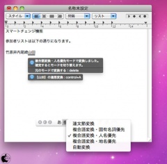 ATOK 2011 for Macでは、これまで「連文節変換」「複合変換・固有名詞優先」「複合変換・人名優先」「複合変換・地名優先」などの変換モードを切り替えて使用することが出来ましたが、文字を入力中に、これから入力する文字に対して予めモードを切り替える必要があったり、そもそも機能を知らないというユーザーが多かったため、新たに「スマートモードチェンジ」機能が追加され、入力傾向を先読みして、自動的に変換モードを切り替えてくれるようになりました。