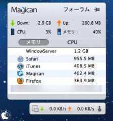 デスクトップにフローティング表示されるパネルでは、ダウンロード量、アップロード量、CPUやメモリの使用状況、アプリケーションのメモリ使用状況などを確認することが出来ます。