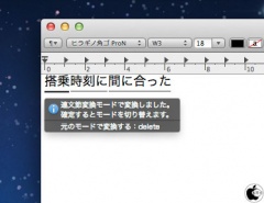 同音語の選択精度がより向上し、以前のATOKでは「登場/時刻に/間に合った」だったのが、ATOK 2012 for Macでは「搭乗/時刻に/間に合った」となり、前後の言葉の統計情報を用いることで、正しいと思われる候補表示精度が向上しているそうです。