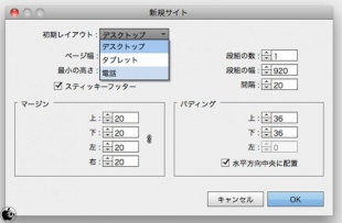 新規サイト作成に、初期レイアウトとして「デスクトップ」「タブレット」「電話」という3パターンが用意されています。