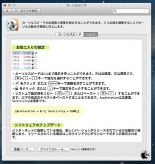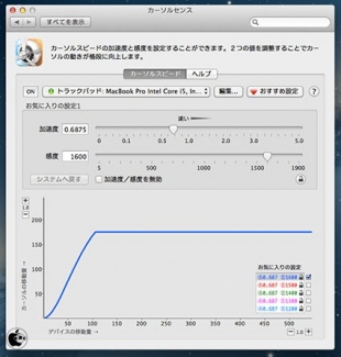 カーソルの動きはマウスの移動量を元に「軌跡の速さ」と「感度」を用いて計算されていて、システム環境設定は「感度」を調整することが出来ないため、好みの設定に調整できず不満を感じる事が多い状況を改善することが出来ます。