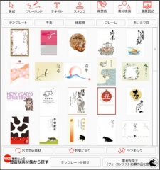 一から作成するソフトというよりかは、素材検索から多数用意されている年賀状デザインを貼り込んで、少し編集したりするといったソフトウェアのようです。
