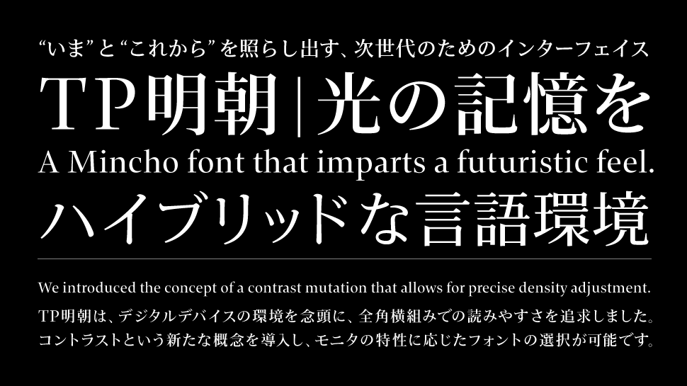 タイププロジェクトが、ウエイトのバリエーションに加え、コントラストという概念を導入し、様々なシーンで利用できる明朝体フォント「TP明朝」を発表しています。