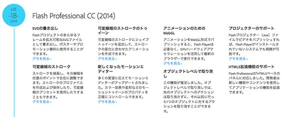 Adobe Flash Professional CC (2014)は、Flashプロジェクトのあらゆるフレームを拡大可能なSVGファイルとして書き出しできる「SVGの書き出し」や、ストロークを描画し、その線幅を任意のポイントで自在に調整できる「可変線幅のストローク」機能などが提供されています。