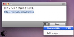 つぶやきの投稿は、別ウィンドウが表示され、長いURLを入力した場合、アクションボタンで、Shorten URLsを選択すると、短縮URL化してくれます。