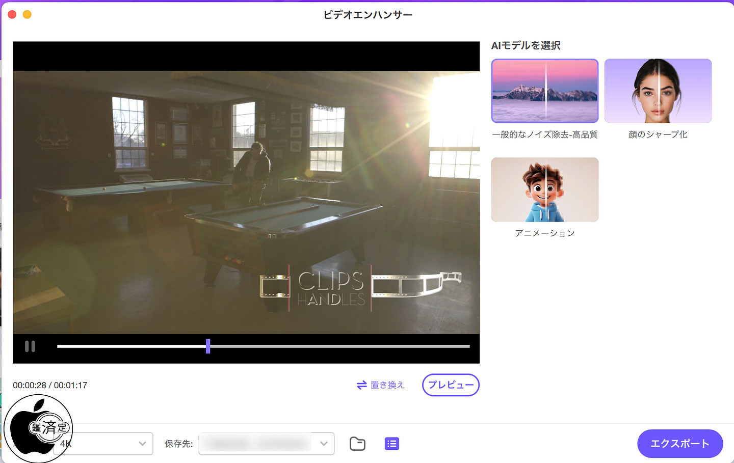 古い映像の修復や人物の鮮明化、アニメーション動画の画質向上など、用途に応じて選べる3つの強化モードを搭載しています。