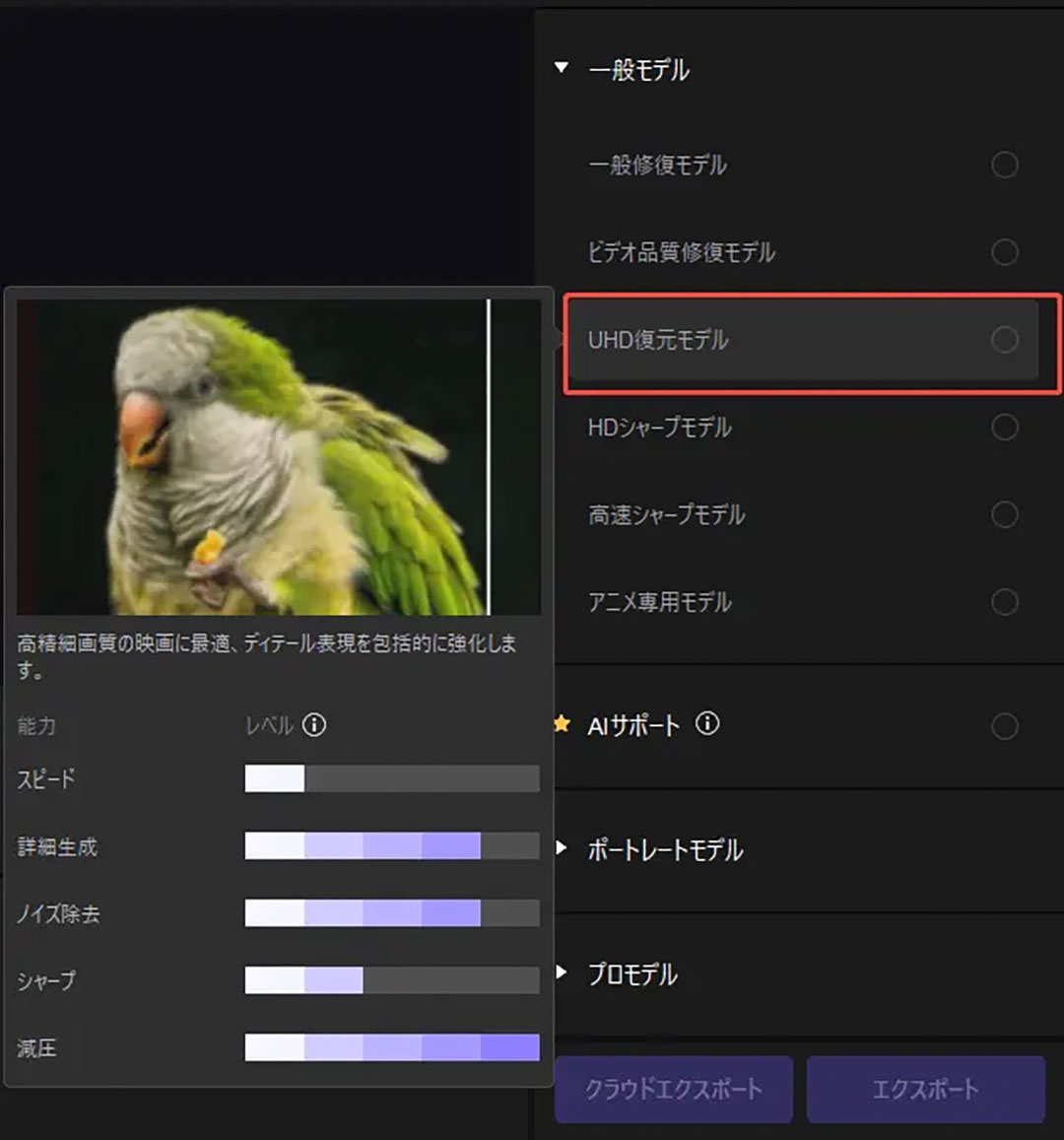 AIが動画に最適なモデルを選択、ワンクリックで高画質化を実現します。