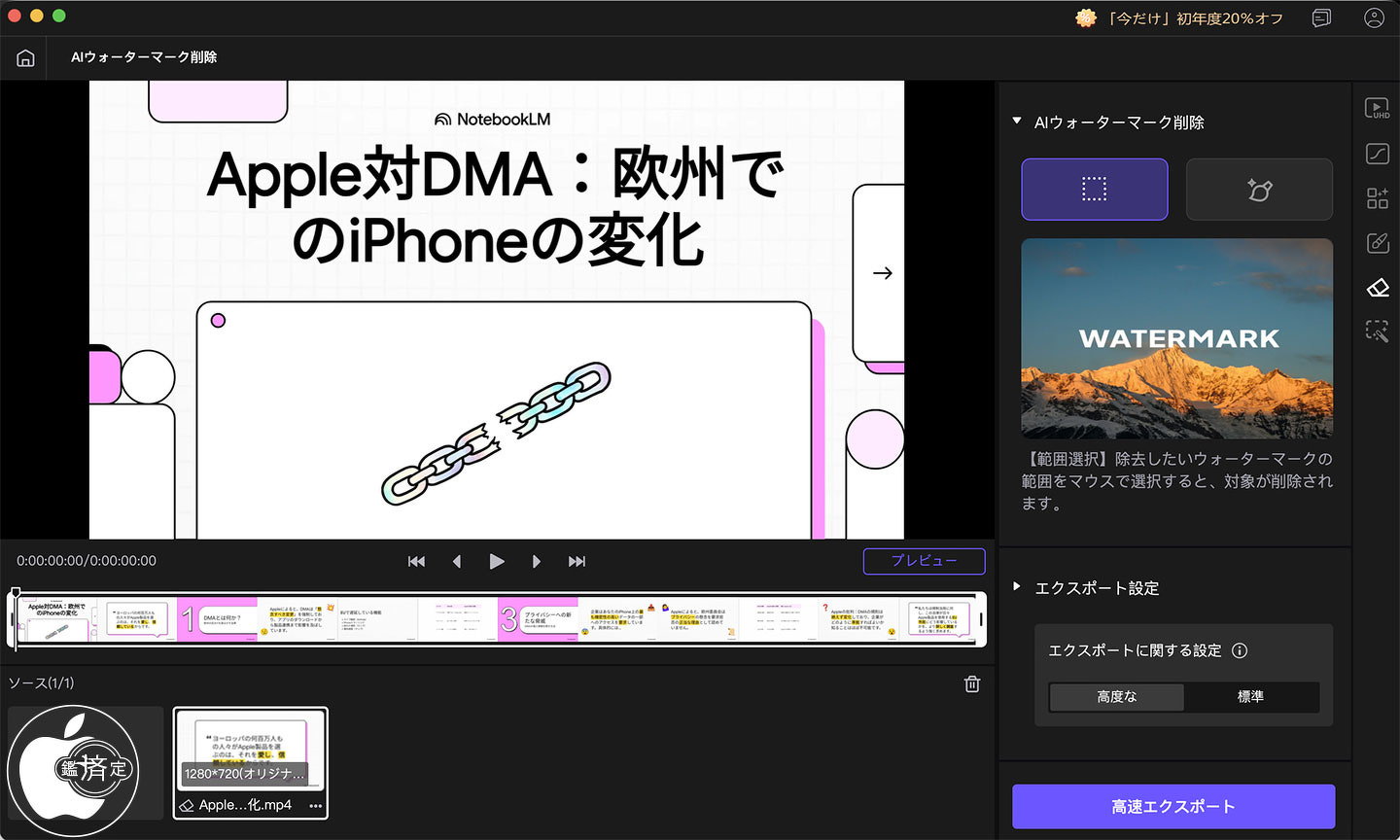 HitPaw VikPea for Mac Ver.5.0.0から、新たに追加された透かし除去機能により、動画からロゴや透かしを正確に除去し、クラウド技術を活用することで処理速度を大幅に向上させます。