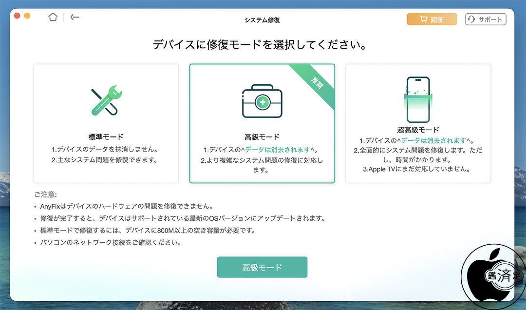 150種類以上のiOS、iPadOS、tvOSのシステム問題の修復に対応し、ほぼ全ての状況を網羅しています。