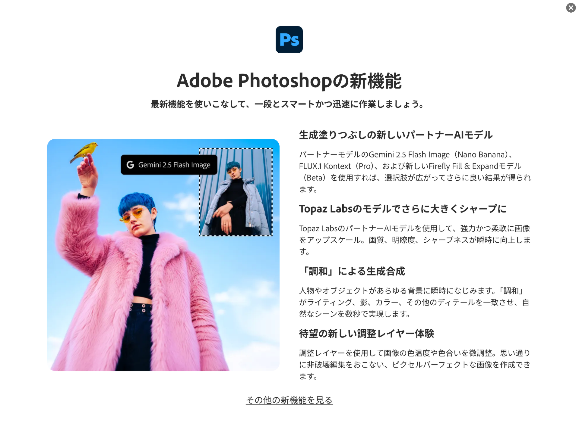 Adobe Photoshopは、Google Gemini 2.5 Flash Image、Black Forest Labs FLUX.1 Kontext、Firefly Image Models などの新しいパートナー AI モデルを使用したジェネレーティブ フィルの結果が強化され、クリエイティブ プロフェッショナルは、シーンの一貫性と視覚的な調和を維持しながら、簡単なプロンプトでコンテンツを追加、削除、または変更するための正確で指示的な編集を行うことができます。