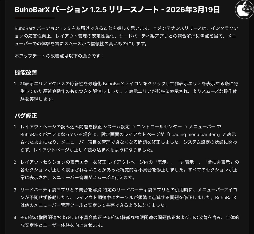 Dr.Buhoが、Macのメニューバー管理を快適かつ効率的にするmacOS向けユーティリティアプリ「BuhoBarX」の最新バージョン 1.2.5 をリリースしています。