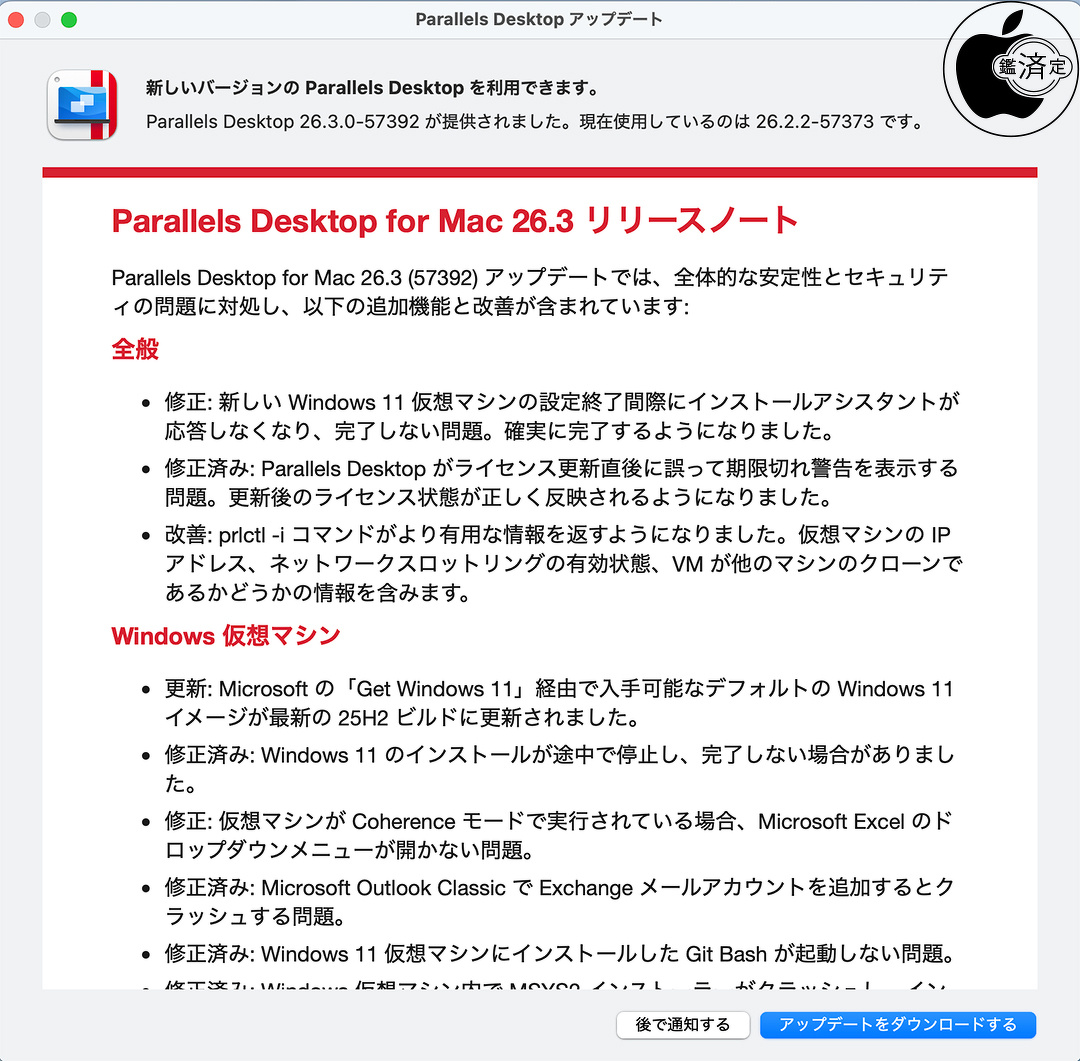 Parallels Desktop for Mac 26.3 (57392)アップデートでは、全体的な安定性とセキュリテイの問題に対処し、以下の追加機能と改善が含まれています。
