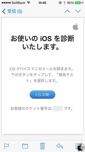 iOSデバイス側で、Appleから届いた「お使いの iOS を診断いたします。」メールを開き、メール本文上にある「iOS 診断」ボタンをタップします。