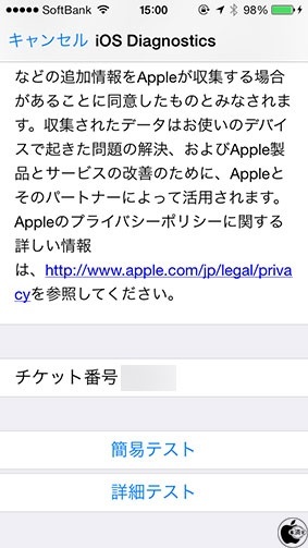 Appleのサポート上に表示されてる「iOS 診断」で診断が進行中です。の表示がされます。