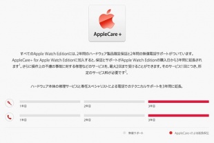 Appleが、Apple Watch Editionの保証に関して、2年間のハードウェア製品限定保証と2年間の無償電話サポートがついていると説明しています。