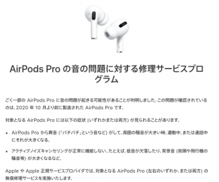 Appleが、AirPods Proに関して、2020 年 10 月より前に製造されたごく一部の AirPods Pro に音の問題が起きる可能性があることが判明したとして「AirPods Pro の音の問題に対する修理サービスプログラム」の提供を開始しています。