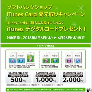 ソフトバンクモバイル、ソフトバンクショップでiTunes Card購入額に対して最大2000円分のデジタルコードをプレゼントする「ソフトバンクショップ iTunes Card 夏先取りキャンペーン」を開始
