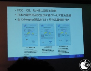 世界で販売している電源製品は、世界の電気関連認証を取得しており、18ヶ月保障をつけていることもポイントだと説明していました。