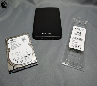 アップグレード用に用意したのは、CrucialのPC3L-12800 DDR3L SDRAM SODIMM仕様の8GBメモリ「Crucial 8GB DDR3L-1600 SODIMM」、SeagateのNAND型32GBキャッシュ内蔵1TBHDDドライブ「ST1000LX001」に加えて、センチュリーのUSB 3.1 Gen 2仕様のUSB3.1接続2.5インチHDD/SSDケース「シンプルBOX 2.5 USB3.1」です。