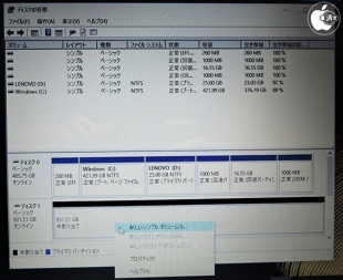 Lenovo ideapad 300にシンプルBOX 2.5 USB3.1を接続し、ディスク管理から「MBR(マスターブートレコード)」を選択して、ディスクの初期化を行います。